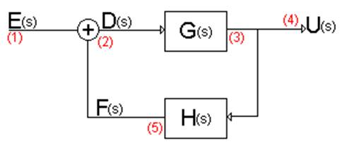 Il sistema ha una funzione d'ingresso o input [E(s)], una funzione di uscita o output [U(s)], e una funzione di trasferimento che è rappresentata dai componenti (2), (3) 949e42j e (5), che sono, rispettivamente: