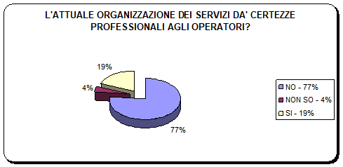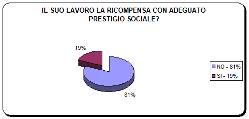 Alla domanda "Qual è il clima che respira nel suo ambiente di lavoro?" 6 intervistati rispondono che è "demotivante", 4 lo definiscono "competitivo", 6 "irritante", per uno esso è decisamente da "burn-out". Non solo: su 26 intervistati 7 si sentono sfiniti al termine della giornata, 2 sono stanchi al pensiero di affrontare un nuovo giorno, 1 si sente esaurito dal lavoro, 3 sono frustrati, 2 ritengono di lavorare troppo duramente, 2 sentono di non farcela più, 2 affermano che lavorare con le persone è causa di troppa tensione, 1 è preoccupato per l'eccessivo coinvolgimento emotivo nei casi trattati. Come viene gestita tale tensione? Hobby, giardinaggio, passeggiate con il coniuge, attività manuali, lettura, sport, viaggi sono le risposte date. Un lavoro dunque, quello sociale, scelto per passione (dal 46% degli intervistati), per vocazione (dal 14%) ritenuto utile (dal 90% del campione) ma dal quale, sembra, ci si deve distrarre a tutti i costi!