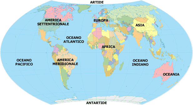 La Terra è divisa in cinque Continenti: Europa, Asia, Africa, America, Oceania.