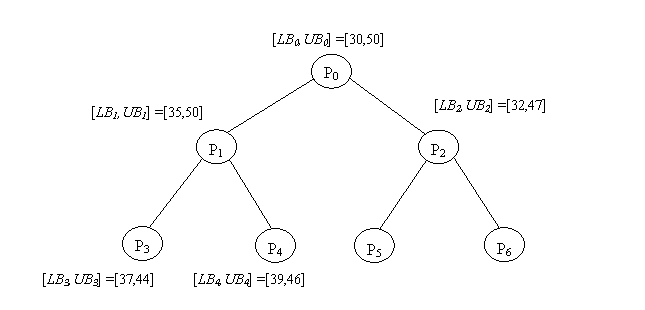 cui, per ogni nodo Pi, sono indicati il valore del rilassamento (LBi) e il valore della miglior soluzione trovata