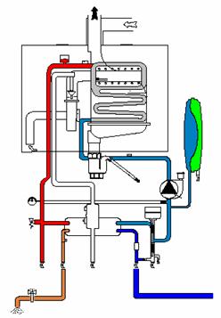 In modo riscaldamento, il circolatore spinge l'acqua del circuito primario attraverso il corpo dello scambiatore che la riscalda.