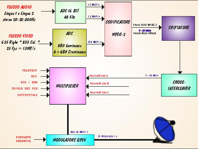 I flussi analogici (video e audio) vengono digitalizzati, cioè vengono convertiti in una sequenza di 0 e 1 tramite un convertitore A/D e compressi con l'algoritmo MPEG2. Se necessario vengono criptati. Questi flussi (più alcune informazioni per la decodifica e per il sincronismo) vengono multiplexati insieme in uno stream DVB/MPEG2 a formare il PES (Packetized elementary stream). Ogni PES viene distribuito in pacchetti di trasporto TPS lunghi 188 byte, contenenti un byte di sincronismo, 3 byte di prefisso (PID), dei quali attualmente solo i 2 byte meno significativi vengono utilizzati, e 184 byte utili detti payload.