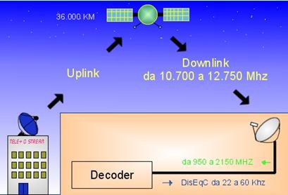 Un satellite quindi è un ripetitore, riceve un segnale da un punto sulla terra e lo ritrasmette in un altro. Il collegamento da terra verso il satellite è detto up-link, mentre quello dal satellite verso terra down-link.