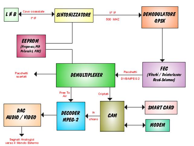LNB: Low Noise Block. E' situato sul fuoco dell'antenna parabolica. Il suo compito è quello di amplificare il segnale e traslare la banda delle frequenze ricevute dal satellite, attualmente comprese tra 10.700 e 12.750Mhz, in una banda di frequenze più basse denominata 1° IF (prima frequenza intermedia) compresa tra 950 e 2150 Mhz. L'LNB è collegato al decoder tramite un cavo coassiale con trasmissione fullduplex asimmetrica: il decoder invia (sul canale DisEqC del cavo coassiale) i dati della banda (banda bassa o banda alta) e della polarizzazione all'LNB del canale da visualizzare, L'LNB invia sul cavo coassiale lo stream selezionato.