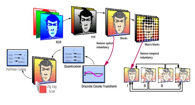 Ogni quadro viene suddiviso in blocchi di 8x8 pixel (alcune righe o colonne vengono scartate o raddoppiate per ottenere blocchi tutti da 8x8 pixel ) ad ognuno dei quali viene applicata la Trasformata Discreta del Coseno (DCT).