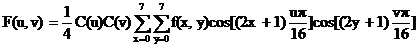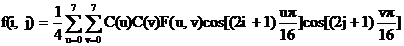 dove F(u,v) sarà il coefficente della DCT del blocco 8x8 nella posizione (u,v) della matrice 8x8 che memorizza i coefficenti trasformati, f(x,y) il valore presente nel blocco 8x8 dei campioni dei pixel in posizione (x,y) e con: