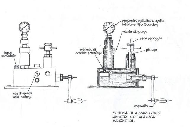 L'apparecchio Amsler ha la funzione di tarare e di collaudare i manometri. Esso sfrutta il principio di Pascal: appoggiando un peso sulla sede di appoggio del pistone, questo appl 959e41j ica una pressione che sposta l'olio contenuto nel banco Amsler. Questa pressione viene misurata dal manometro e deve essere uguale al rapporto tra la forza applicata e la superficie del pistone: P = F/A. Nel sistema internazionale l'unità di misura è il Pascal (Pa =N/m2).